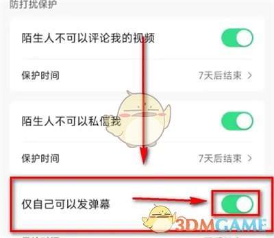 5、最后我们在进入的页面里找到“仅自己可以发弹幕”,随后在它的后面点击对应的开关按钮。当按钮变为绿色为即为开启,如此即可设置为仅自己可以发弹幕。