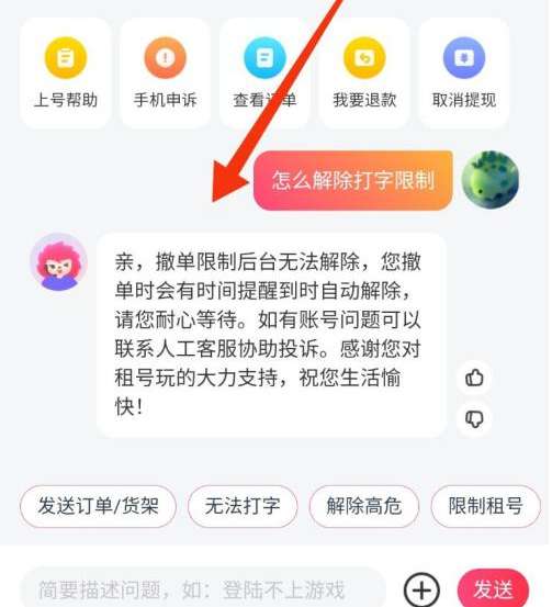 点击租号玩客服,如下图,发送怎么解除打字限制,看到租号玩客服的回复就知道了,这样就可以
