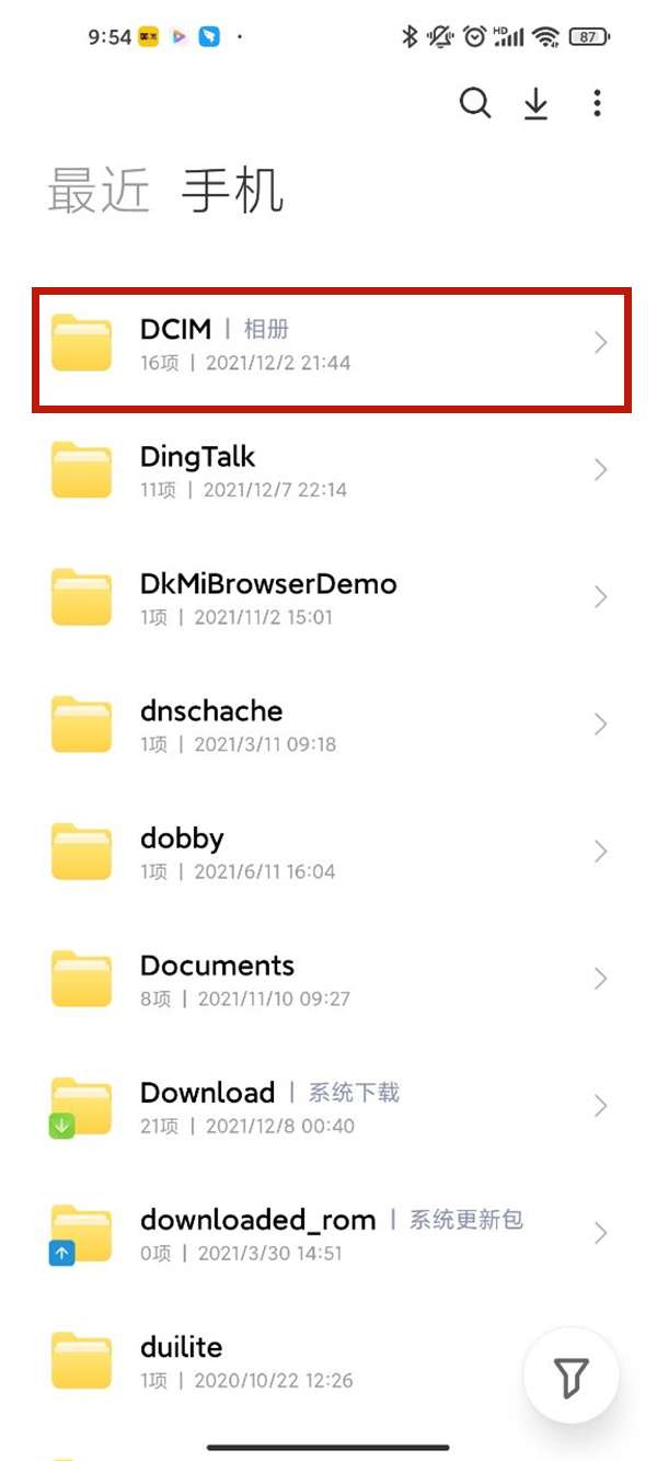 1、打开文件管理,点击DCIM文件夹。