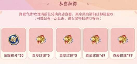 夺宝奖池包含了真爱令牌(兑换皮肤的道具)、花嫁稚遇头像框、积分夺宝券、皮肤碎片、荣耀积分和真爱玫瑰(包含了3-29朵、39/69/99朵)。