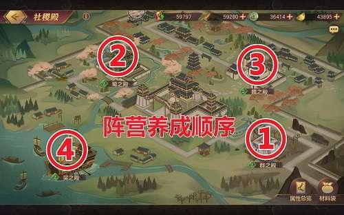 1、首先社稷殿养成跟能不能最低通关关卡有很大关系,社稷殿一共分为5个建筑,包括4个阵营建筑和中心的演武场,4个阵营建筑分别需要4种材料养成。