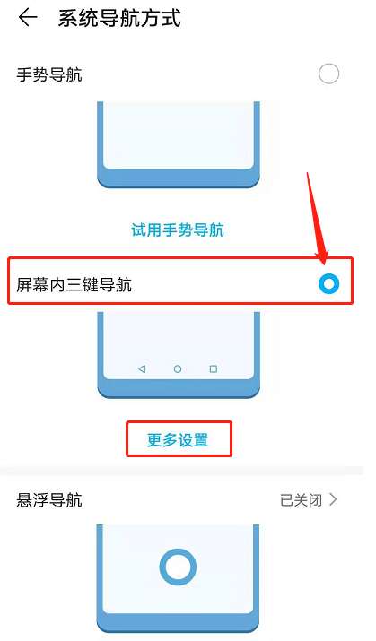 3、打开【屏幕内三键导航】,选择【更多设置】,你还能挑选导航键样式。
