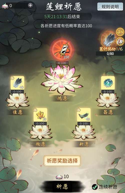 1、首先是莲鲤祈愿,有五种不同的奖励以供选择,这里大家一定要优先选择古宝,然后再是其他奖励,对于其他奖励来说总之大家缺什么选什么,就好比第一个,有些人缺升星石,但有些人就缺灵尘!