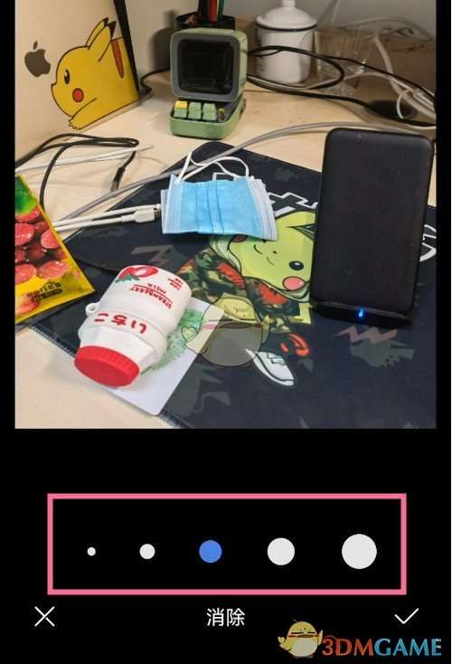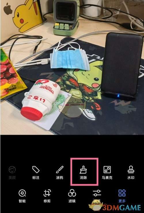 2、进入更多>消除,根据想要消除的对象选择合适的画笔大小,对其进行涂抹并覆盖完成点击保存即可。