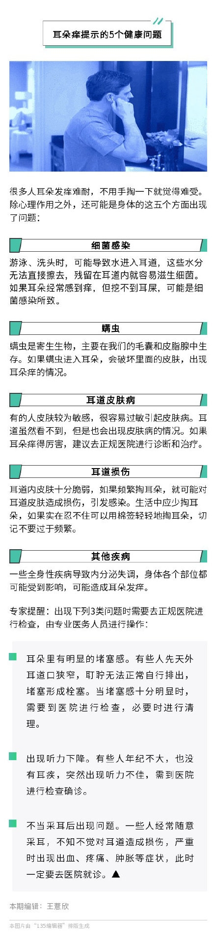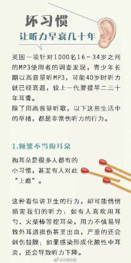 一些不经意的小习惯,比如总戴耳机、掏耳朵,很可能让你的耳朵就此“受伤”。一套给耳朵的养护手册↓↓好好善待它