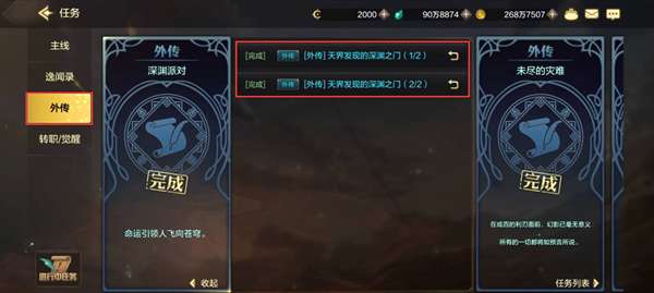 3、完成48级外传任务【天界发现的深渊之门】后可以开启深渊副本,通过挑战副本可以获得深渊精粹和史诗装备。