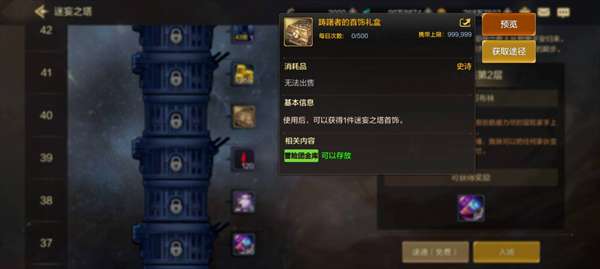 2、通关40层和50层迷惘之塔,可以领取【踌躇者】史诗礼盒,开启可获得一件随机的首饰。