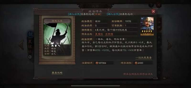绝地反击在目前已有的s战法中效果也是比较突出的,无论是其武力加持还是五回合固伤。在很多队伍中都是较为适用的,特别是三势蔡文姬和核弹张飞队,更是能完美发挥这个战法的全部效果。 End