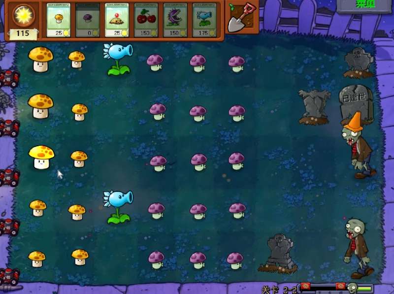 小喷菇的射程比较短,所以最好种在比较靠前的位置。而阳光菇和寒冰射手放在后排更好。等到位置占满之后,就可以吧多余的小喷菇铲掉,种上更有用的坚果或者食人花。这一关的前期僵尸来的比较慢,所以难度并不算高。我们可以用阳光优先种植阳光菇。让它有更多时间成长。然后等免费的小喷菇cd转好后就在每一排都种上一个。基本上两个小喷菇可以在3格内击败一个普通僵尸。如果哪一行有铁桶僵尸出现,就提前种上土豆雷。等种满两排阳光菇和小喷菇之后,阳光就会富裕起来了。这个时候能种上一些寒冰射手负责减速。后期要注意地上的墓碑可能会爬出来一些僵尸,而且墓碑占据的地面无法进行种植。所以最好提前在最近的墓碑前面种上一些坚果,这样才不至于在最后一波僵尸出现的时候难以应对。在后面可能会随机刷新出读报僵尸,用坚果挡住或者食人花吃掉就可以了。