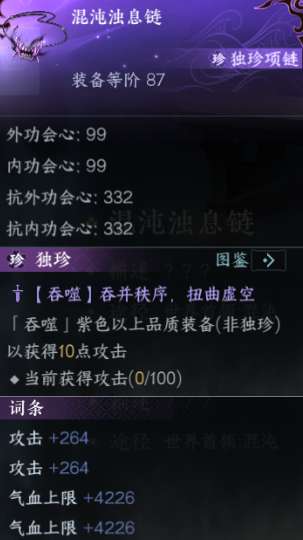 独珍效果吞噬10件紫装可获得100攻击,缺紫装并且等不及的玩家可前往汴京936,1089游晓傲处花费交子购买。