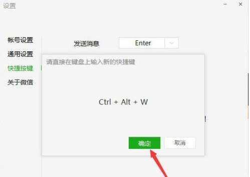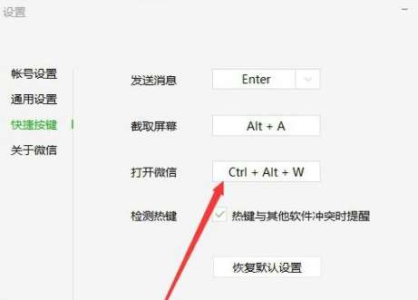 然后可以看到打开微信的默认快捷键时“Ctrl+Alt+W”,要修改点击即可,如图所示。