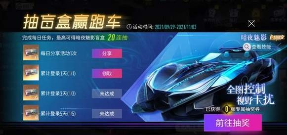 暗夜魅影跑车是在9月29日至11月3日期间限时盲盒活动中获取的跑车,玩家每日完成任务最多可获得免费的20连抽盲盒。