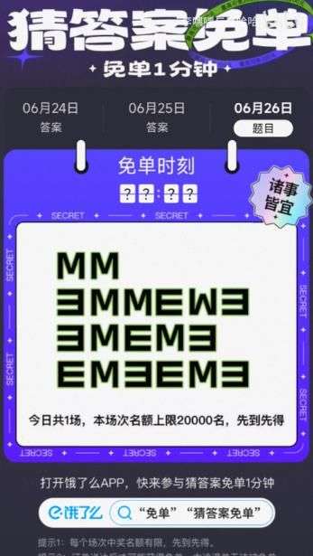 饿了么6月26日的免单一分钟题目已经公布了,大家需要根据官方给出的题目找出线索,确认免单时间和免单的类目。下面小编就为大家带来了饿了么免单一分钟6.26答案,饿了么6月26日免单1分钟攻略,希望对你有所帮助。