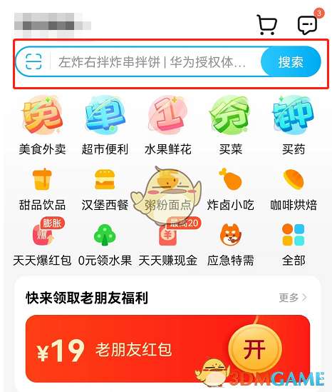 1、更新饿了么至最新版本,点击首页上方搜索框。