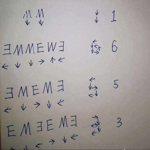 1、依照字母的开口方向,两个E代表->正的E代表1(正的E代表从左往右划,反之);