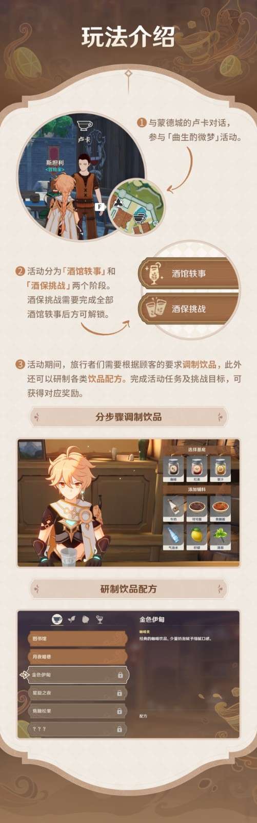 原神曲生酌微梦怎么玩?原神近期开启了曲生酌微梦活动,在活动中玩家将担任酒保为顾客调制饮品,除了调制饮品还有很多好玩的玩法,下面为大家介绍一下!