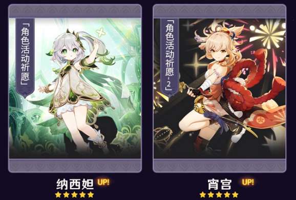 原神3.2版本两个卡池都是双UP,两个新角色纳西坦是在上半而莱依拉则是下半,其中莱依拉是四星。