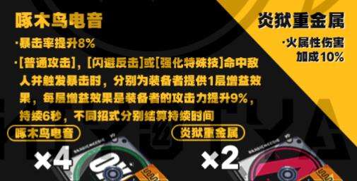 这套配置比火套更适用于11号,啄木鸟提供暴击以及攻击力加成,炎狱则提供火属性伤害加成。