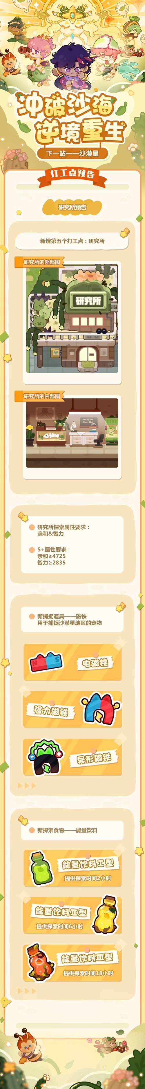 ②新增第五个打工点——研究所,产出新捕捉道具磁铁和新探索食物能量饮料,将在完成沙漠星任务后解锁;