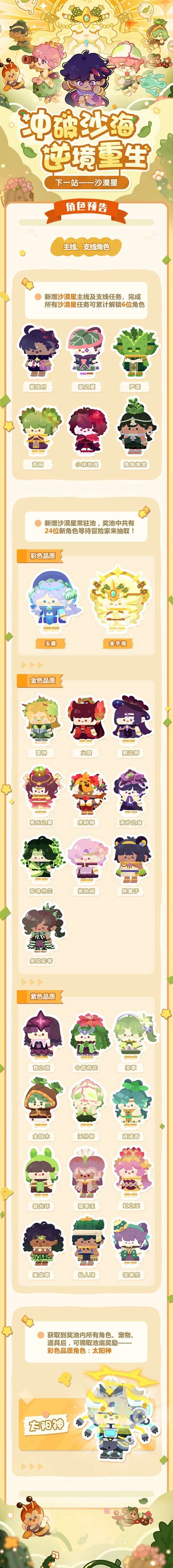 ③新增沙漠星常驻奖池,奖池自更新后将永久开放,奖池内含2个彩色品质角色、10个金色品质角色和12个紫色品质角色,集齐沙漠星奖池内所有角色、宠物、道具及角色家具后可领取池底彩色品质角色——太阳神;