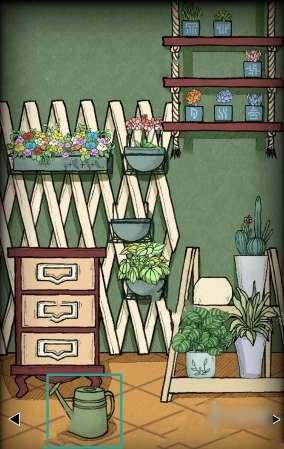 7、用【破窗锤】砸开破裂的砖块,查看里面的书,点击白色花盆,用【空的洒水壶】装水,得到【装满水的洒水壶】。