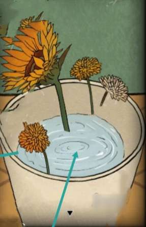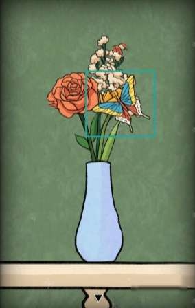 12、点击柜子的第三个抽屉,根据花瓶上的蝴蝶身上对应的区域颜色得到红蓝黄白,结合挂箱上花的颜色和数量,得到密码2374。