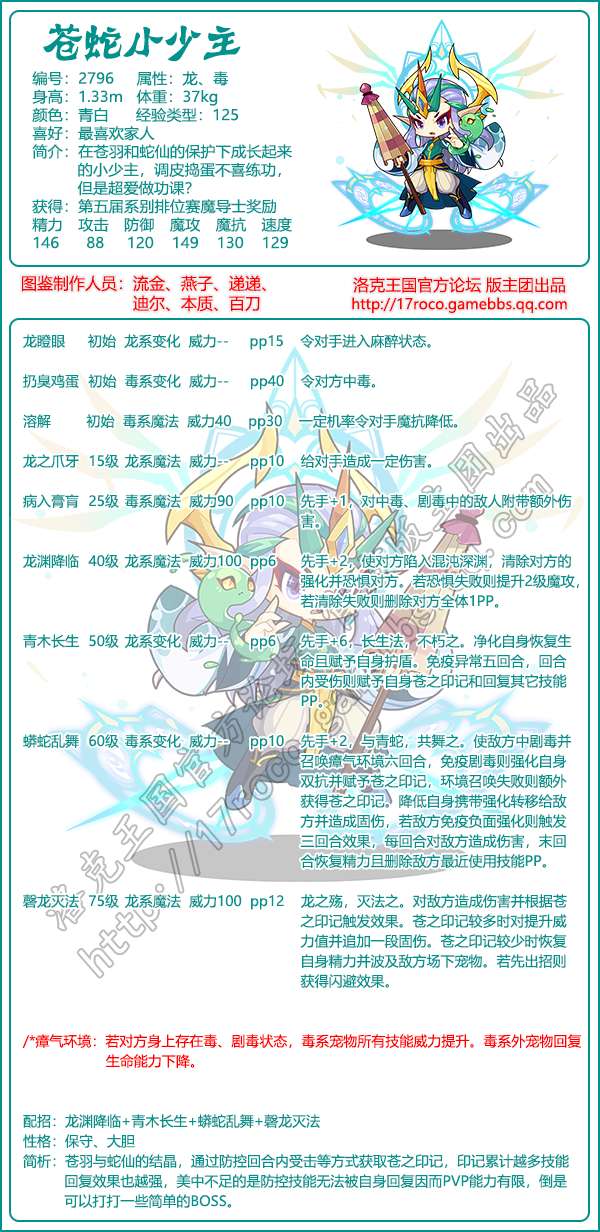 洛克王国游戏中苍蛇小少主是一位魔攻宠物,性格:保守、大胆;技能配招推荐:龙渊降临+青木长生+蟒蛇乱舞+磬龙灭法。玩家可以参加2022年7月29日到2022年9月8日的兰夜河灯活动获得苍蛇小少主,活动的地点位于千户苗寨。