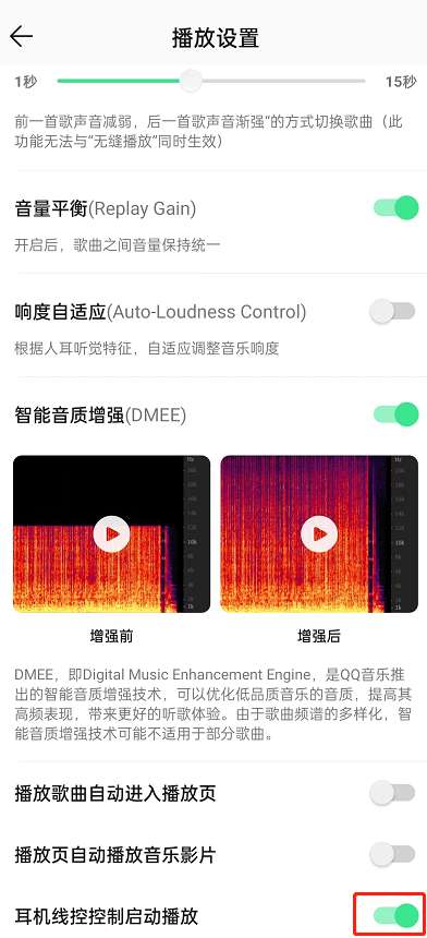 4、找到底部“耳机线控控制启动播放”,关闭右侧开关即可(如图所示)。