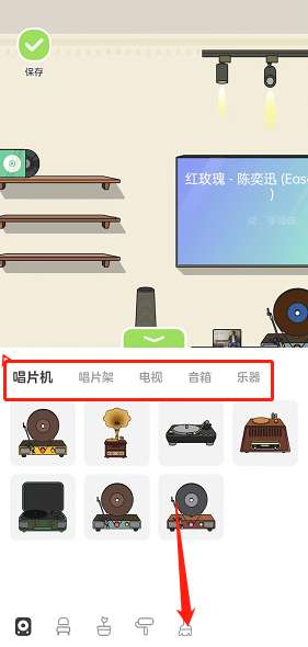 3、选择下方的器具,你可以更换一些家具。点击清理按键,你就可以调整至背景。