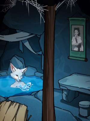 3、接着我们把狐狸放到水池,用剪刀剪蜘蛛网制作成衣服给她穿上,拖动画像上的脸给小狐狸,这关就通关了。