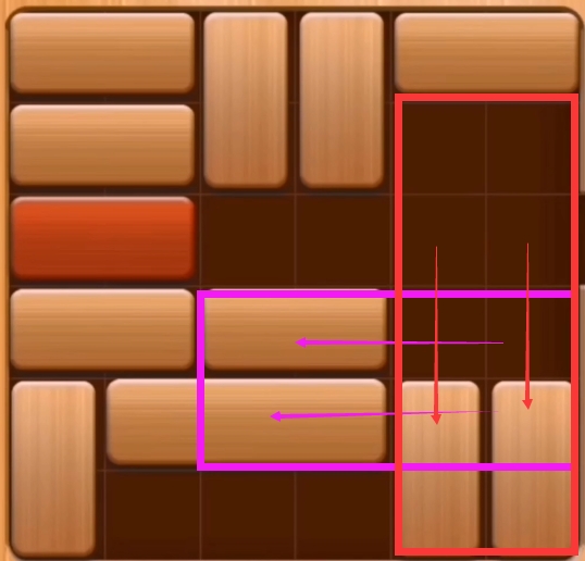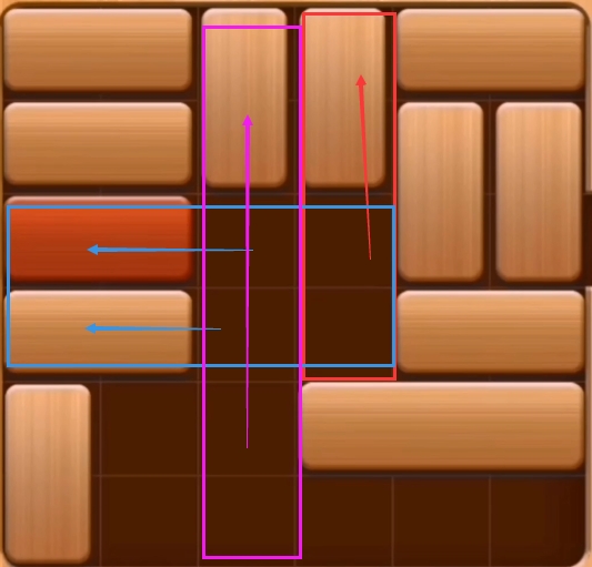 第十步:先将红色内的木块向上移动,然后在将蓝色框内的两块木头向左,最后把粉色区域的木块向上移动。