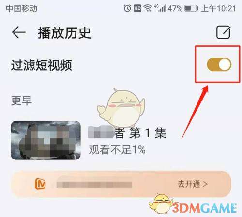 3、进入播放历史页面,打开过滤短视频右侧的开关即可。