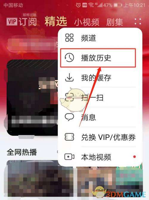 2、在菜单列表中,点击选择播放历史。