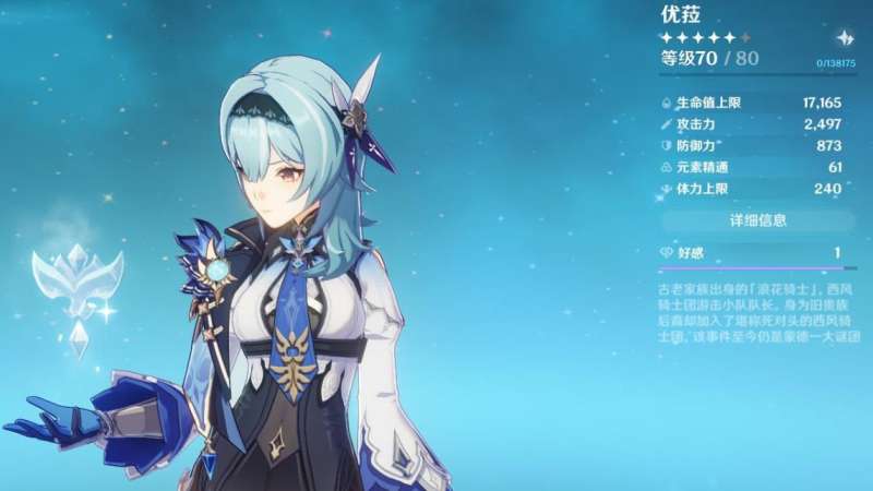 四技能名为逞强,在面对敌方生命值低于百分之五十的角色时,会让自身的伤害提高百分之二十五,更容易收掉残血怪物。五技能名为骑士的素质,属于增益型技能,可提高优莅旋涡的等级,使其冰元素伤害变得更高。最后一个技能名为高贵者的义务,效果是光剑立刻获得五层的能量,对敌人造成爆炸伤害。如果该角色普攻、元素战技和爆发都有造成伤害,使光剑叠上层数的话,那么就有一半的概率额外获得一层能量buff。