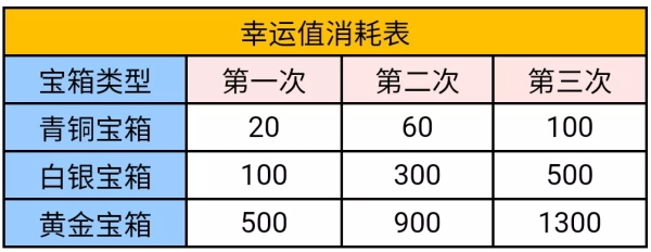 5、许愿宝箱:许愿值类似于保底,3个宝箱就是保底奖池,玩家可以消耗许愿值开启宝箱,活动有青铜、白银、黄金三个许愿宝箱。开启宝箱之前大家需要选定3个许愿奖励,选中的奖励无法在中途更换,也不能重复选择。同时,青铜、白银、黄金宝箱彼此开启进度相互独立,互不影响。已抽中的道具不会重复获得,抽一少一,在宝箱中获得的奖励会直接发往邮箱。另外,每次开启宝箱消耗的许愿值会逐渐递增,具体消耗可参考下表。