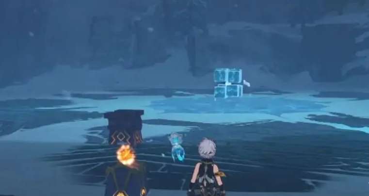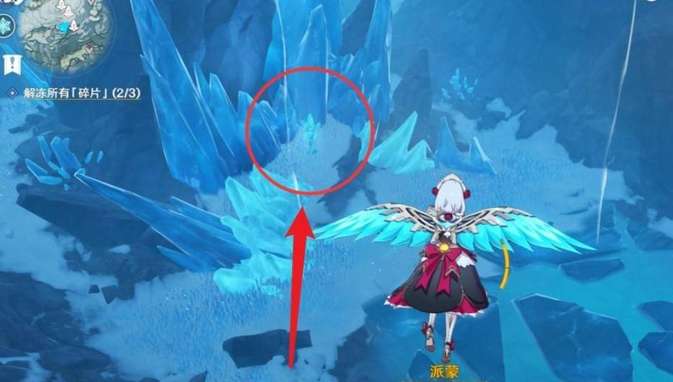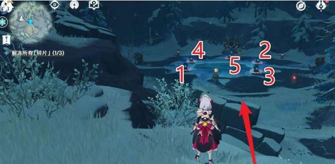 2、来到雪葬之都·近郊,按照图中标注的顺序,使用冰角色将元素方碑点亮。然后会出现洞口。进入使用3个深赤之石解锁碎片。