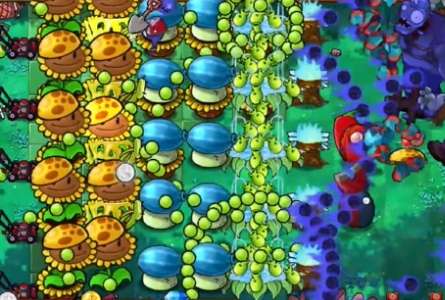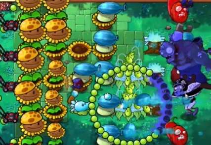 4、在第四列补齐一列冰冻西瓜大喷菇,在外侧种植两个豌豆许愿池。