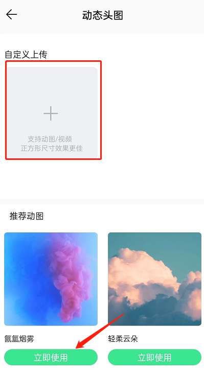 4、最后,选择自己喜欢的动图,点击立即使用即可。也可以自定义上传动图/视频作为动态头图。
