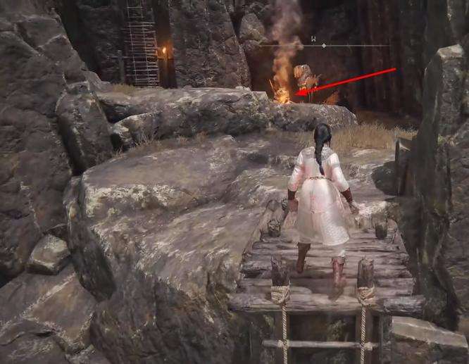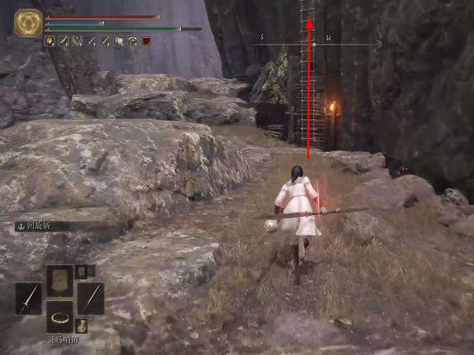 5、爬这个梯子上去就可以看到流浪商人就在前方。