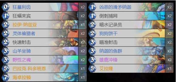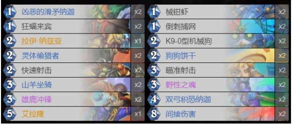 卡组玩法比较简单,前期找1费生物,贴上狗狗饼干和山羊坐骑抢血,抢下血后用直伤获胜。卡组的亮点是双弓积恐纳迦,有两个很高上限的配合就是前中期配合野性之魂打出一大波场面的爆发,后期配合间接伤害打一波伤害。