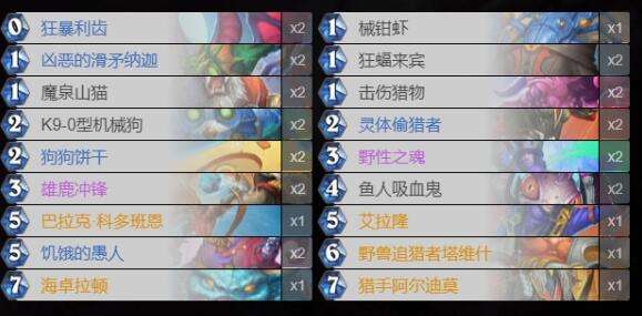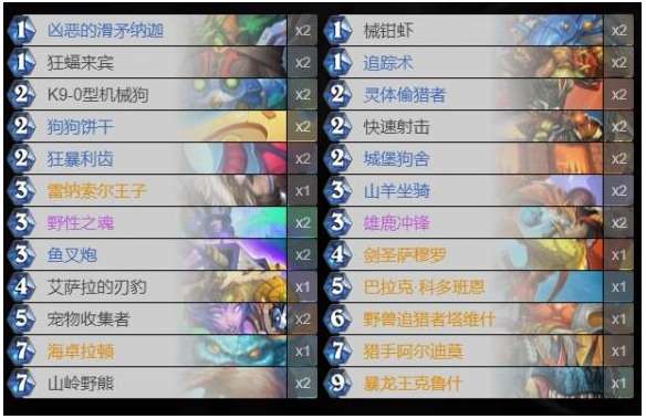 以上版本野兽猎组件为核心的卡组,卡组的中后期质量还是由山岭野熊和暴龙王支撑的,宠物收集者+艾萨拉的刃豹来让高质量野兽提前登场。灵种组件是用来润滑中期曲线的,配合城堡狗舍还能稍微解一下场面。