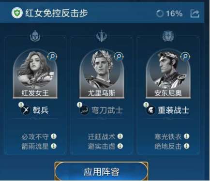 在应对控制较多的队伍时,又可以变阵为“红发女王+尤里乌斯+安东尼奥”的阵容,红发女王有前4回合免控的技能,能有效应对前期主打爆发伤害的控制队。