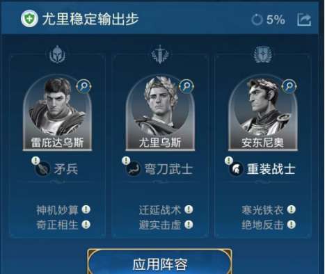 技能搭配上,安东尼奥携带“寒光铁衣”“绝地反击”,尤里乌斯带“迁延战术”“避实击虚”,雷庇达乌斯带“神机妙算”“奇正相生”。