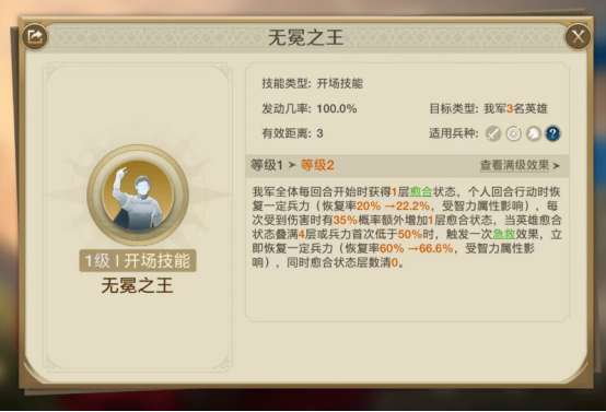 治疗型英雄,一技能“无冕之王”,类似于其他游戏的“DOT”治疗,会在每回合恢复一定兵力,受击也会叠加这个DOT治疗,同时叠满4层或者50%时会有一次快速治疗效果。单看机制来看,尤里乌斯的续航能力非常强,在长线战斗中能发挥极高的治疗作用,但缺点也很明显,缺乏辅助与输出能力,是一位比较单纯的奶妈英雄,所以在配队和技能上就要下功夫了。