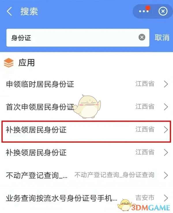 1、进入赣服通,点击搜索框,输入身份证,点击搜索,即可出现身份证相关服务。点击补换领居民身份证,以有效期满换领居民身份证服务为例,点击该服务。