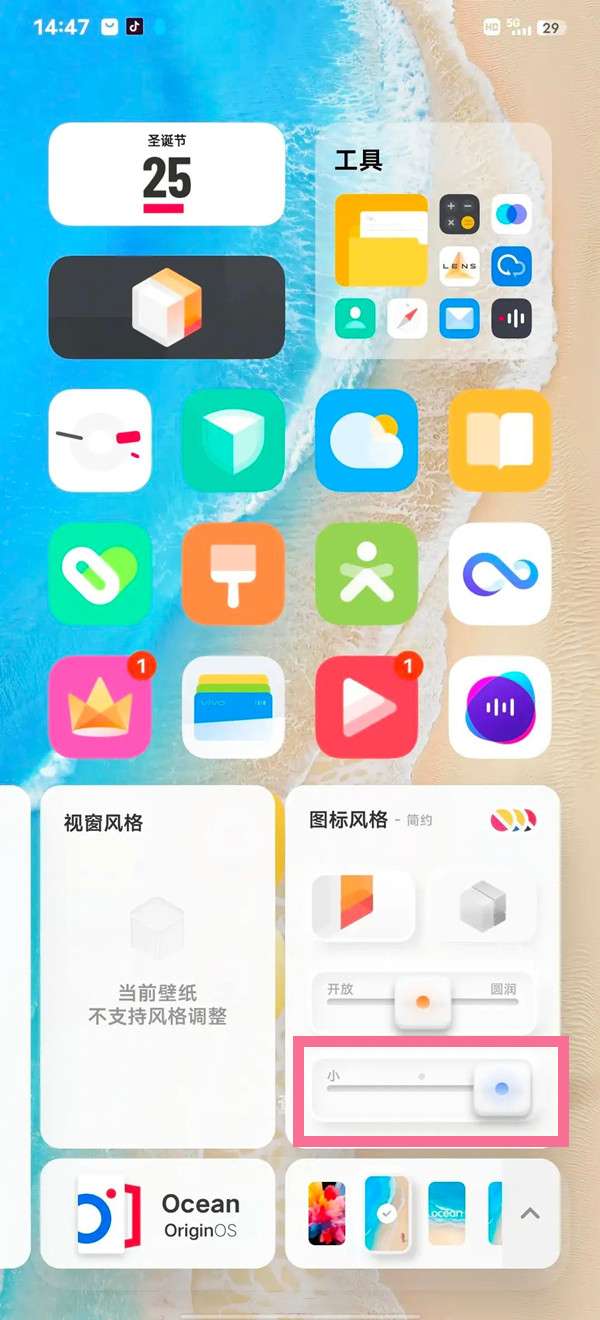 2、找到图标风格,将第二栏的图标大小往右滑动至中/大,即可隐藏桌面文字。