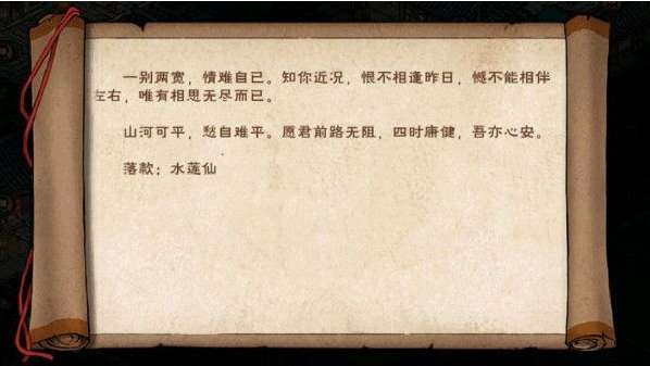 在洛阳处打听思君之祈,就会有一个人送信,收到邮件7两银子和一封信。这封信是随机的,谁都有可能送给你,比如水莲仙,阿紫等,不同人,信件内容也不一样。
