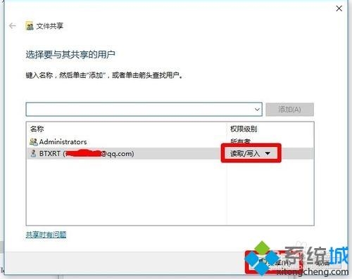 6、待打开“文件共享”窗口后,点击对应账号右侧的“权限级别”下拉列表,从中设置共享文件和文件夹的权限,点击“共享”;