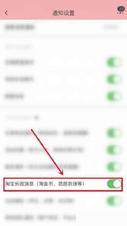 第四步:最后在通知设置页面,将“淘宝乐园消息(淘金币、芭芭农场等)”的按钮关闭,即可关闭淘宝乐园消息通知。