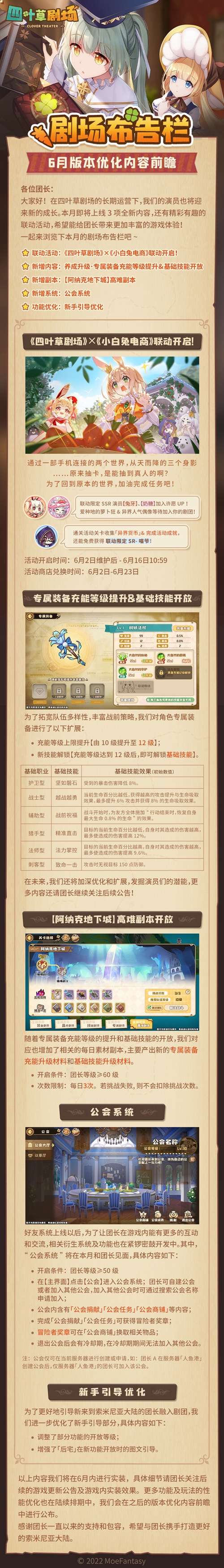 大家好!在四叶草剧场的长期运营下,我们的演员也将迎来新的成长。本月即将上线3项全新内容,还有精彩有趣的联动活动,希望能给团长带来更加丰富的游戏体验!